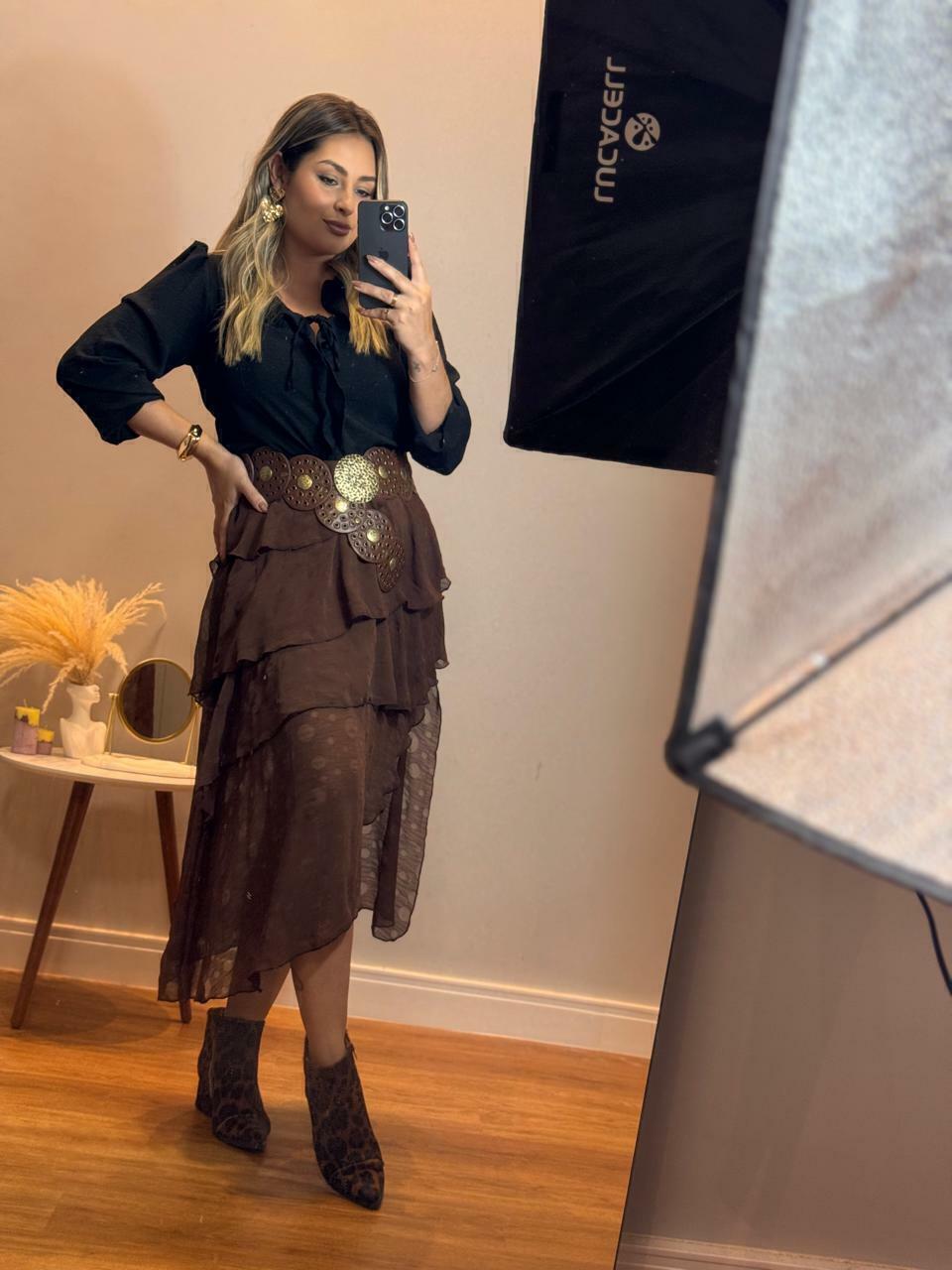 Cinto BOHO em couro com design circular, aplique de ilhós metálicos e fivela dourada detalhada em metal.